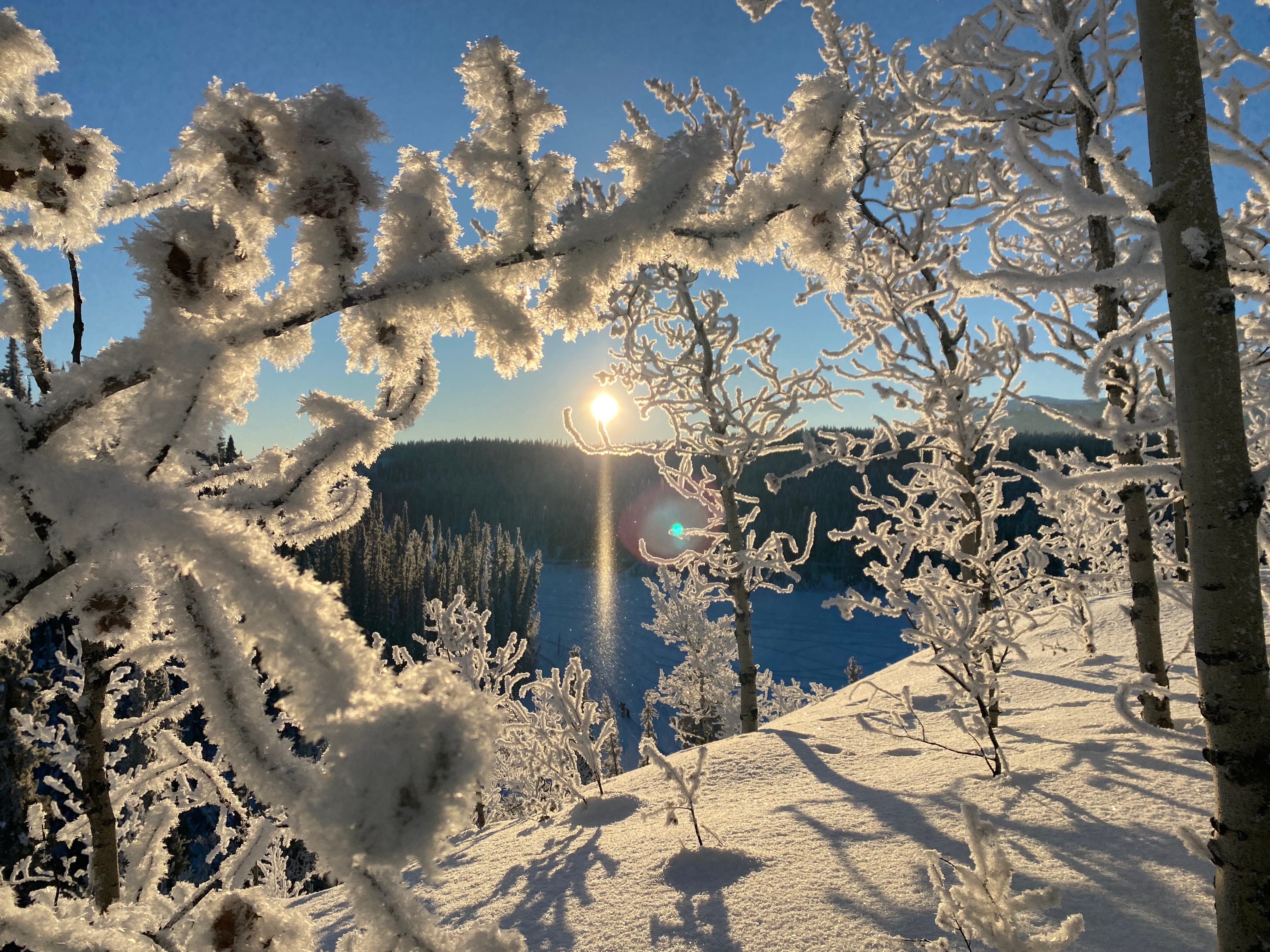 As I made my way up a ridge, I saw something I’d never seen. It wasn’t a classic sun dog, those rainbow like horizontal sun spots. But a gigantic beam of light interpenetrated by diamond snow crystals that looked more like a cosmic vertical universe opening up its arms.